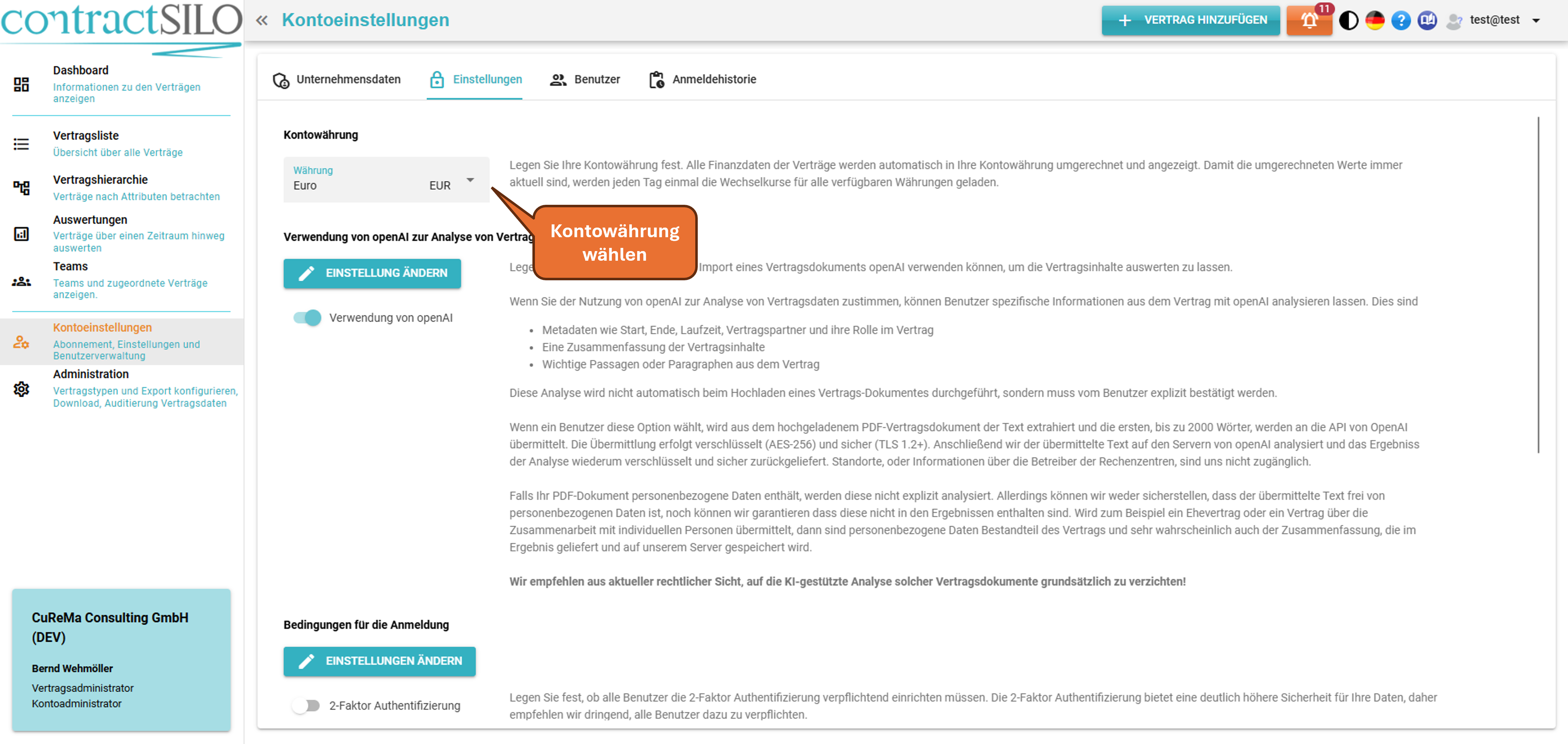 Einnahmen und Ausgaben aus Verträgen können in jeder beliebigen Währung erfasst werden. Um die Finanzanalyse zu erleichtern, werden alle Werte in die Kontowährung umgerechnet. Wird kein EURO verwendet, kann für das Konto eine andere Währung ausgewählt werden. Einnahmen und Ausgaben werden dann sowohl in der Vertragsliste als auch auf dem Dashboard in der gewählten Währung angezeigt.