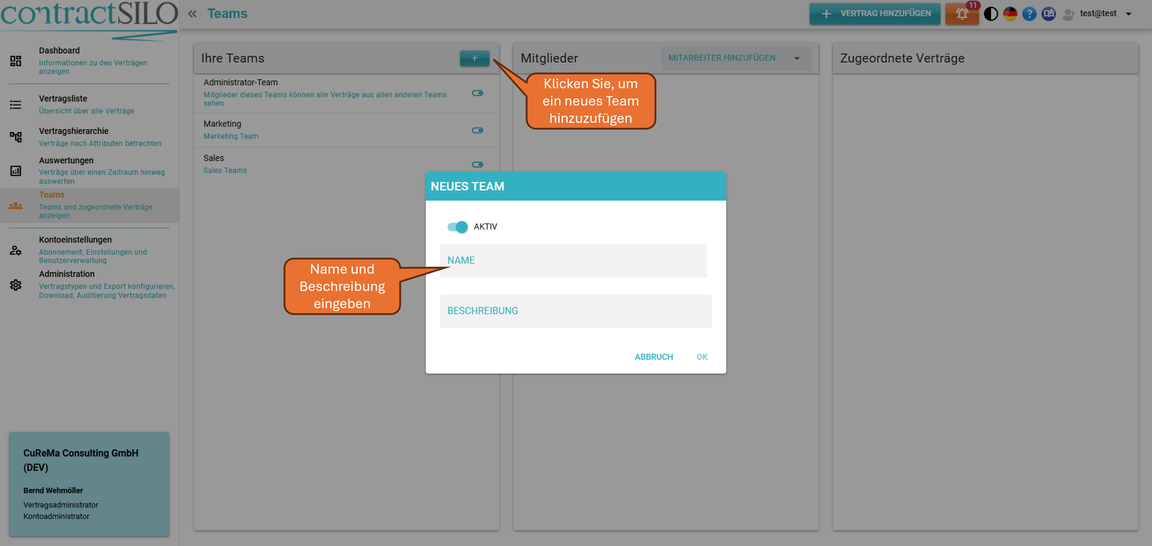 Wir empfehlen Ihnen, sich schon frühzeitig Gedanken über die Teamstruktur zu machen. Später, wenn Sie mehr Verträge im System haben, wird es komplexer und zeitaufwändiger, Änderungen an der Teamstruktur vorzunehmen.