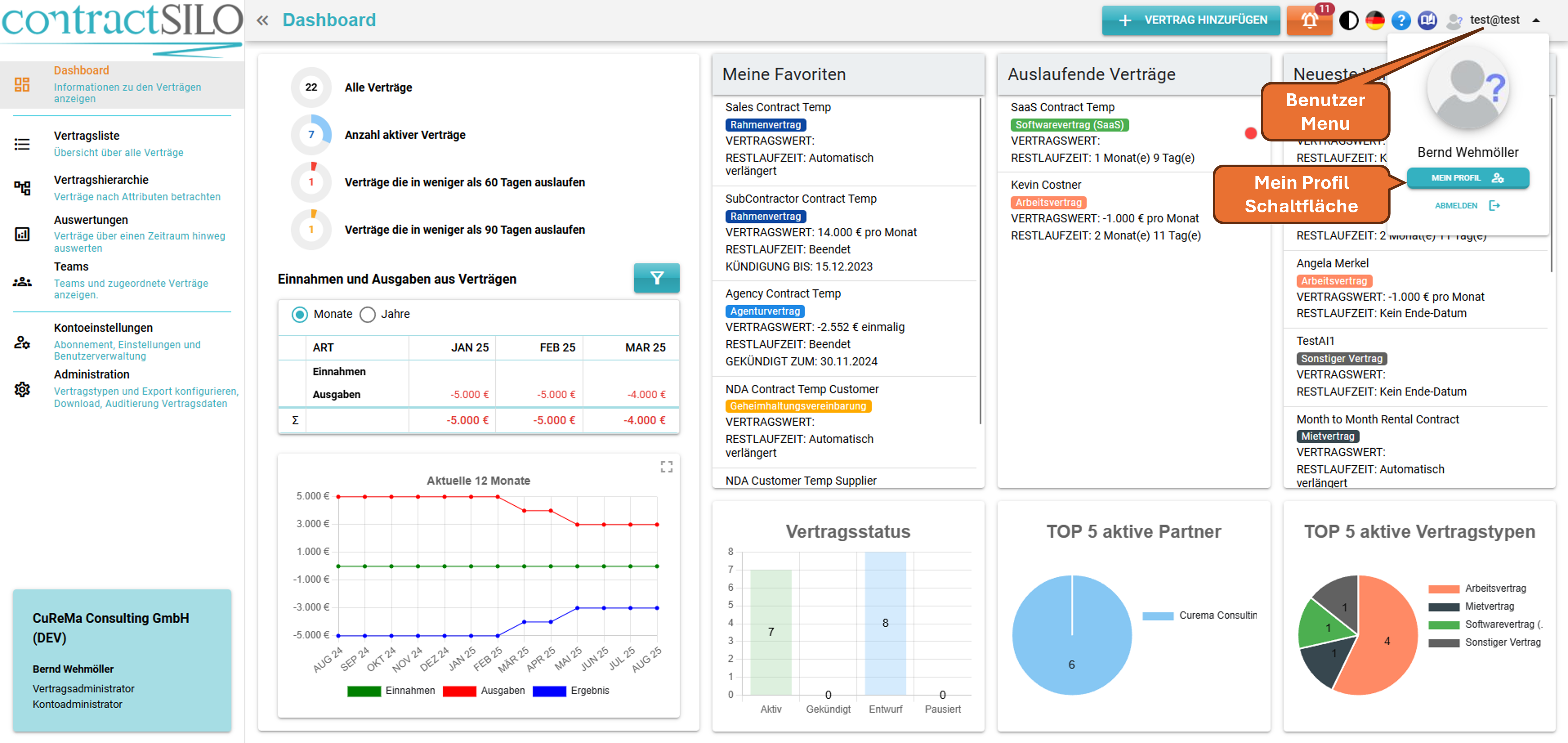 Herzlichen Glückwunsch! Sie haben Ihren ersten Vertrag erstellt und das Vertragsdokument hochgeladen. Wir empfehlen Ihnen, als Nächstes die Themen im Abschnitt „Wie Mann…“ zu erkunden. Alternativ können Sie auch gerne mit den Funktionen experimentieren, die contractSILO bietet. Wir wünschen Ihnen eine angenehme und erfolgreiche Erfahrung mit contractSILO.