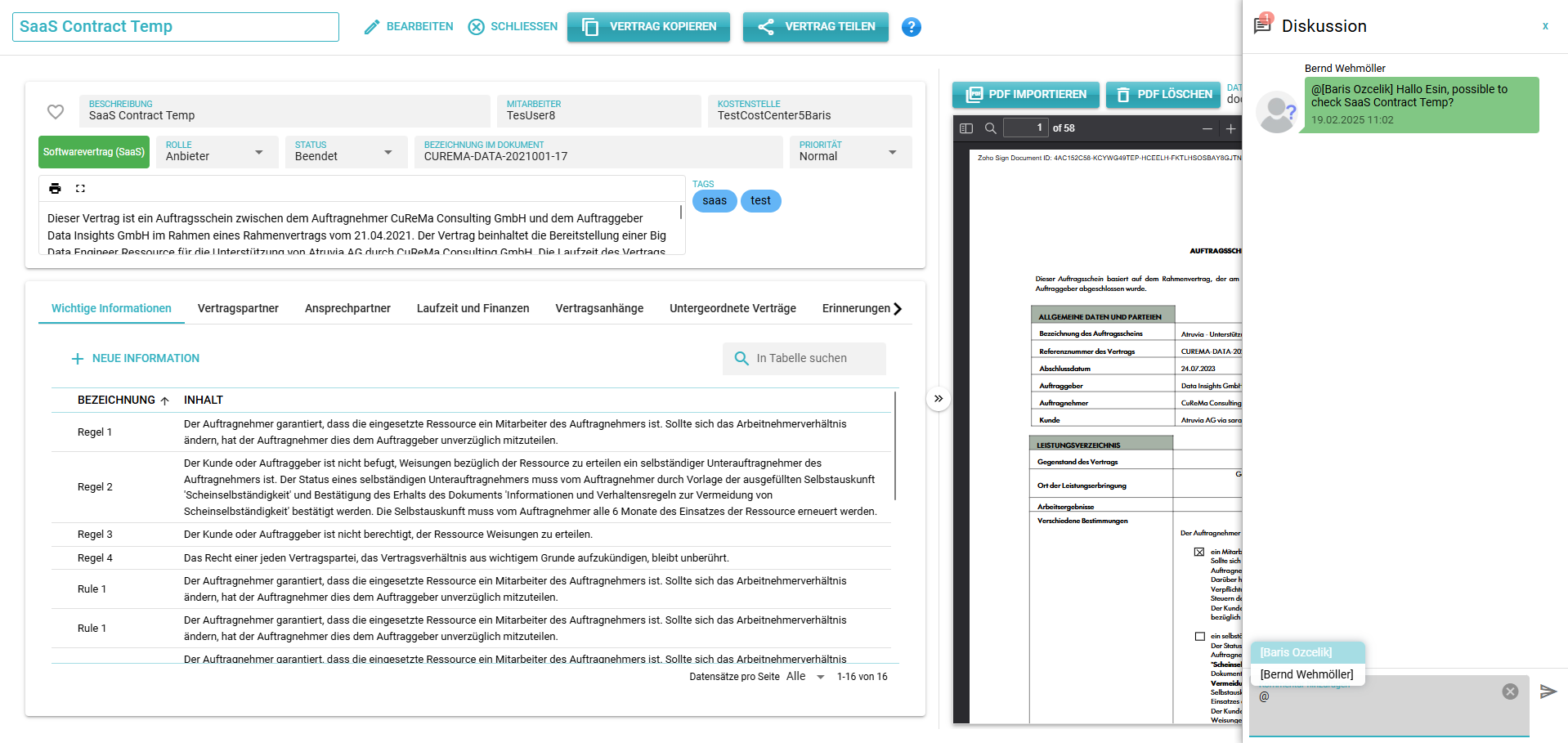 Mit contractSILO können Sie über Verträge diskutieren. Alle Benutzer mit Zugriff auf einen Vertrag können die Diskussion verfolgen und daran teilnehmen. Sie können den Benutzer, dem Sie eine Nachricht senden möchten, auch über das „@“-Symbol auswählen.