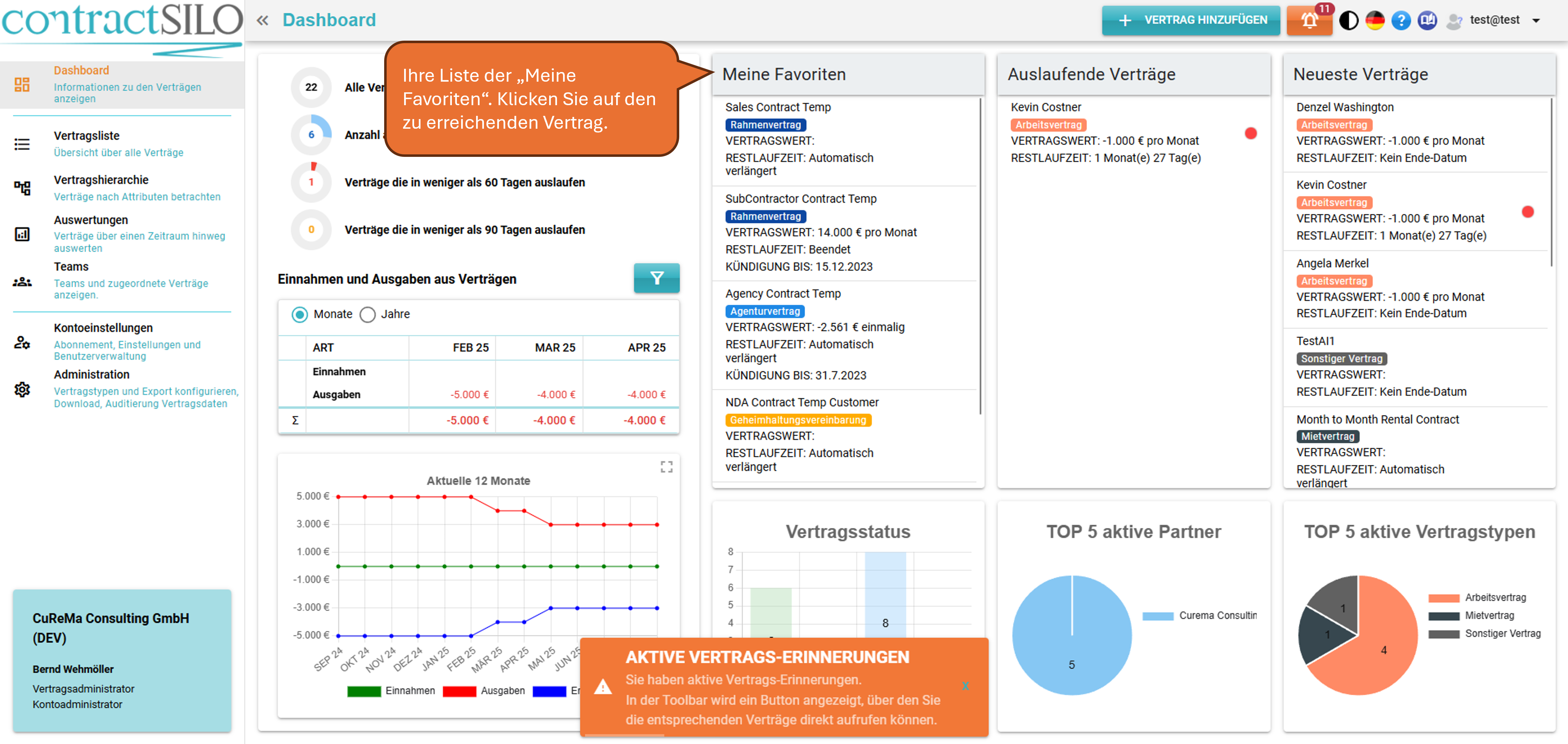 Als Favoriten markierte Verträge werden im Dashboard hervorgehoben und ihre Details können einfach durch Klicken auf den Eintrag in der Liste „Meine Favoriten“ abgerufen werden.