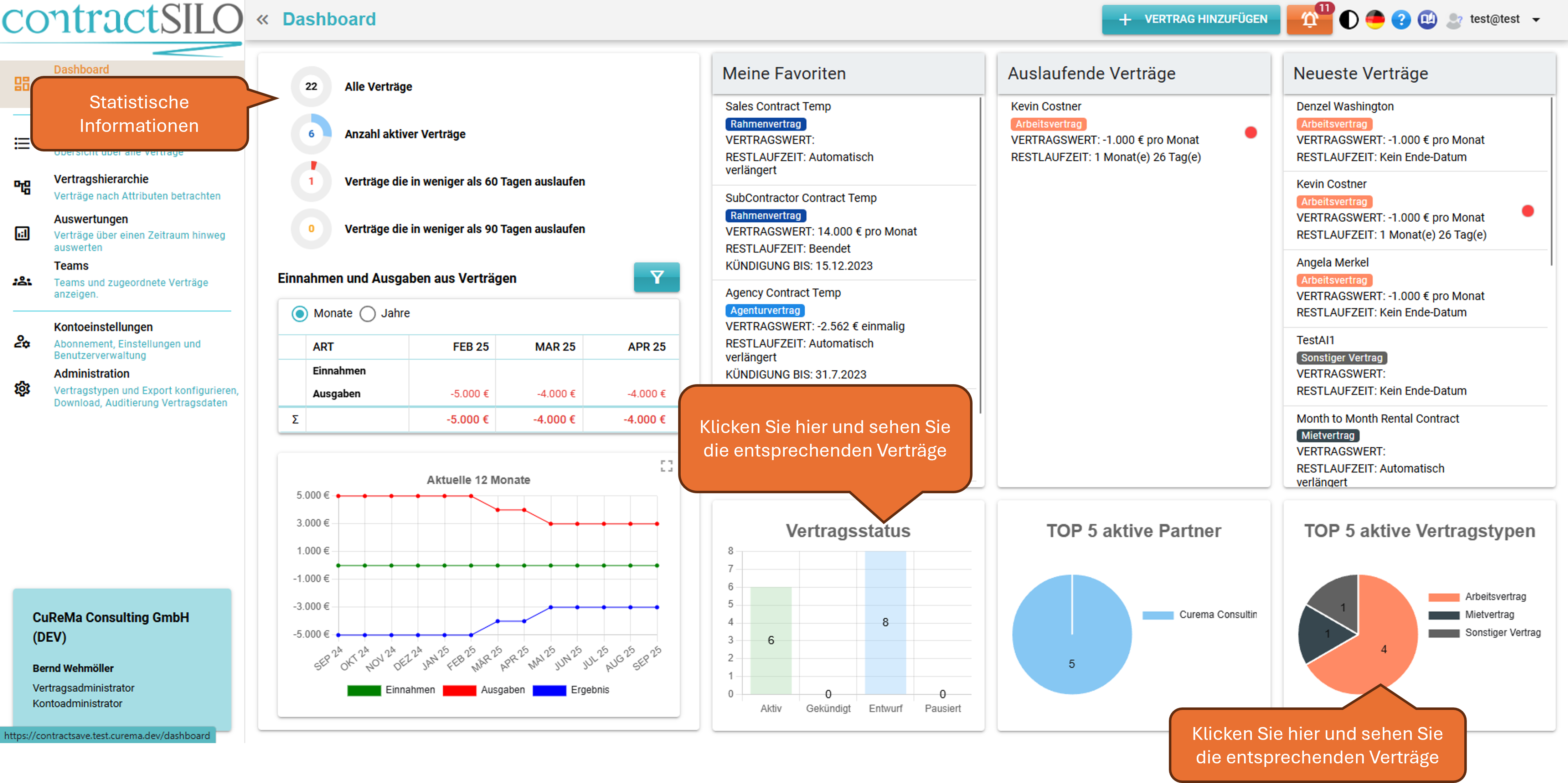 Das Dashboard bietet einen schnellen Überblick über statistische Daten, Einnahmen und Ausgaben im Zusammenhang mit Verträgen. Sie können das Dashboard auch verwenden, um schnell auf bestimmte Verträge zuzugreifen.