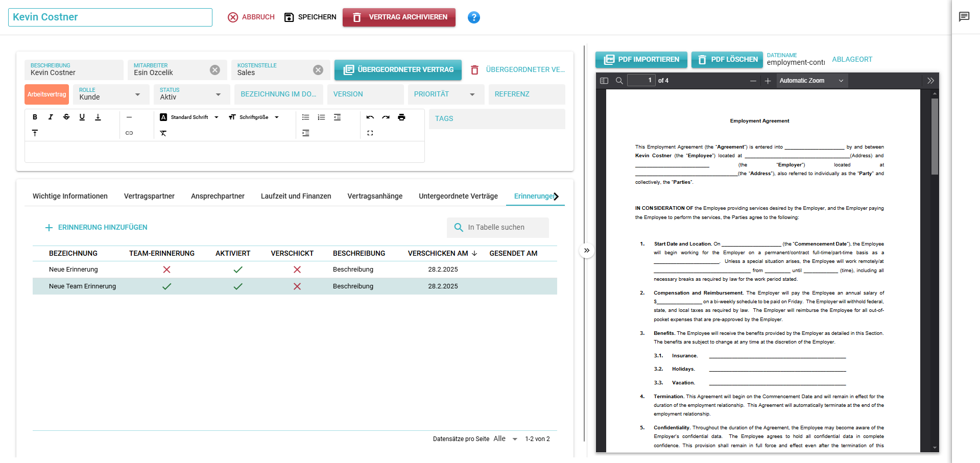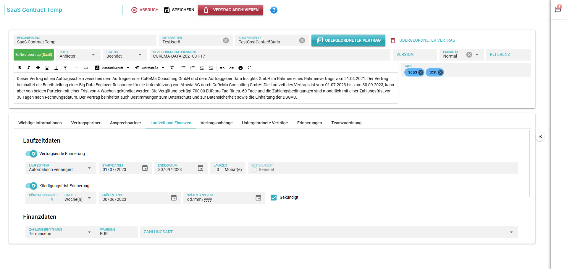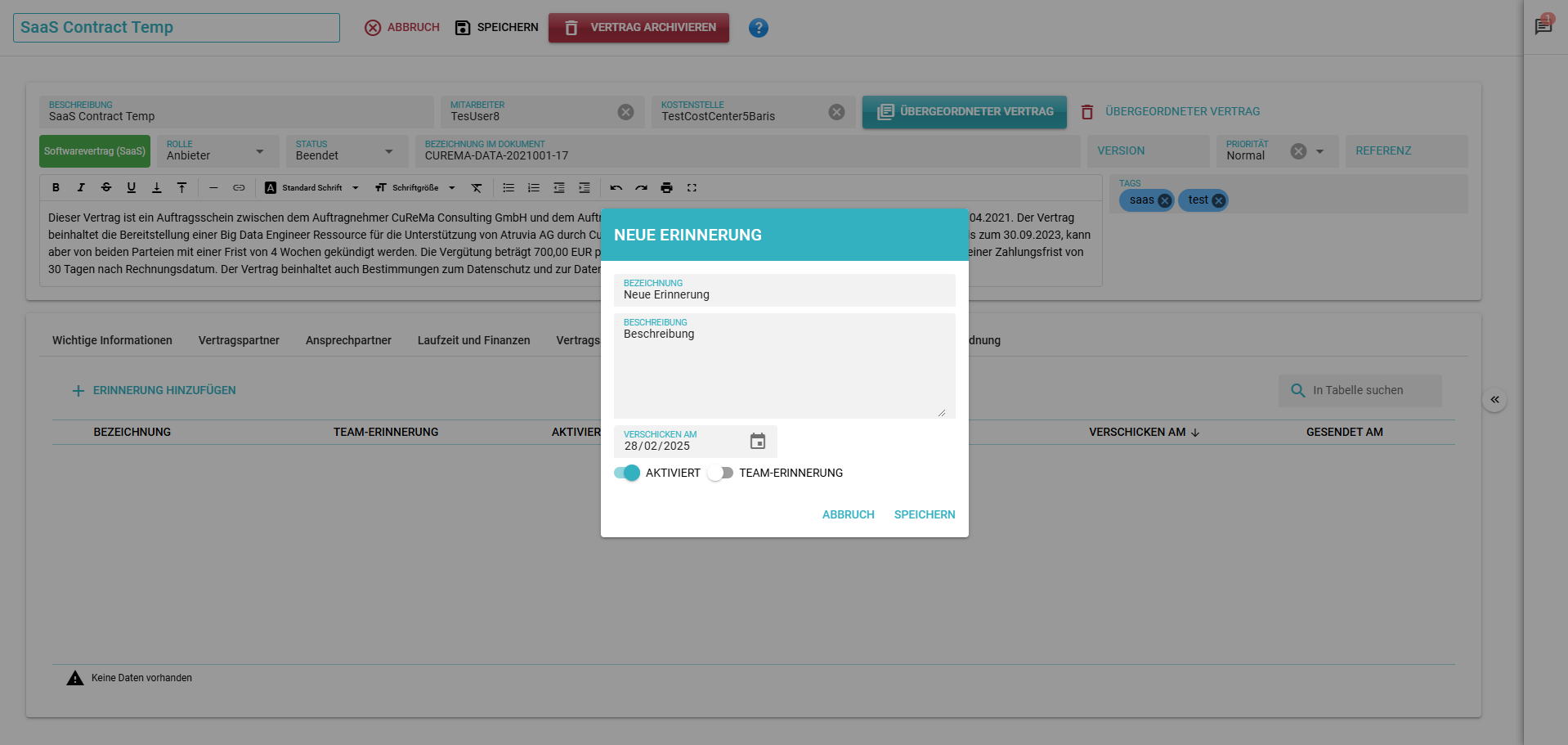 Laufzeit und Finanzen werden die Standarderinnerungen für Vertragsablauf und Kündigungsfristablauf aktiviert.